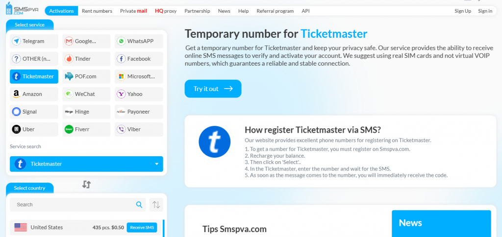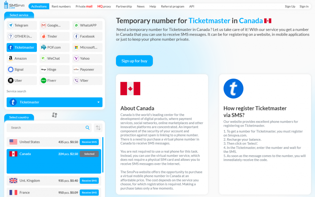 هناك خدمات عبر الإنترنت مثل SMSPVA التي تقدم أرقام هواتف افتراضية مؤقتة. يمكنك استخدام هذه الأرقام لاستلام رموز التحقق عبر الرسائل القصيرة، مما يسمح لك بالتسجيل في منصات متعددة، بما في ذلك Ticketmaster.