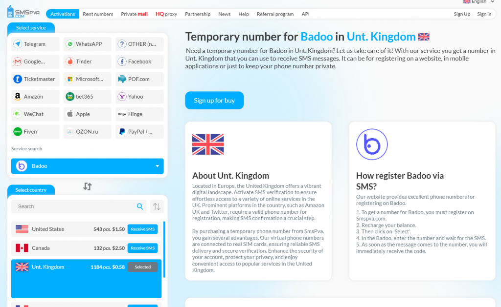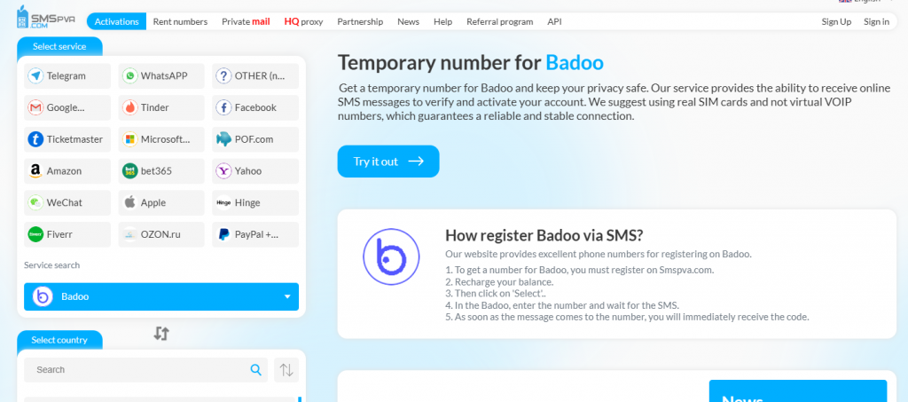 SMS PVA ofrece una solucion de registro en Badoo segura, rapida y fiable. Disfruta del potencial completo de Badoo sin sacrificar seguridad o comodidad. ¡Aprovecha el poder de SMS PVA y conéctate con facilidad!
