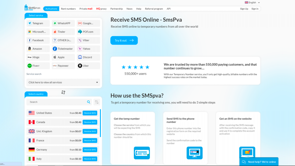 - il existe une variété de méthodes de paiement, des cartes bancaires à la cryptomonnaie. Il est possible de payer pour recevoir des SMS et écrire sur WhatsApp sans ajouter de numéro depuis n’importe où dans le monde;