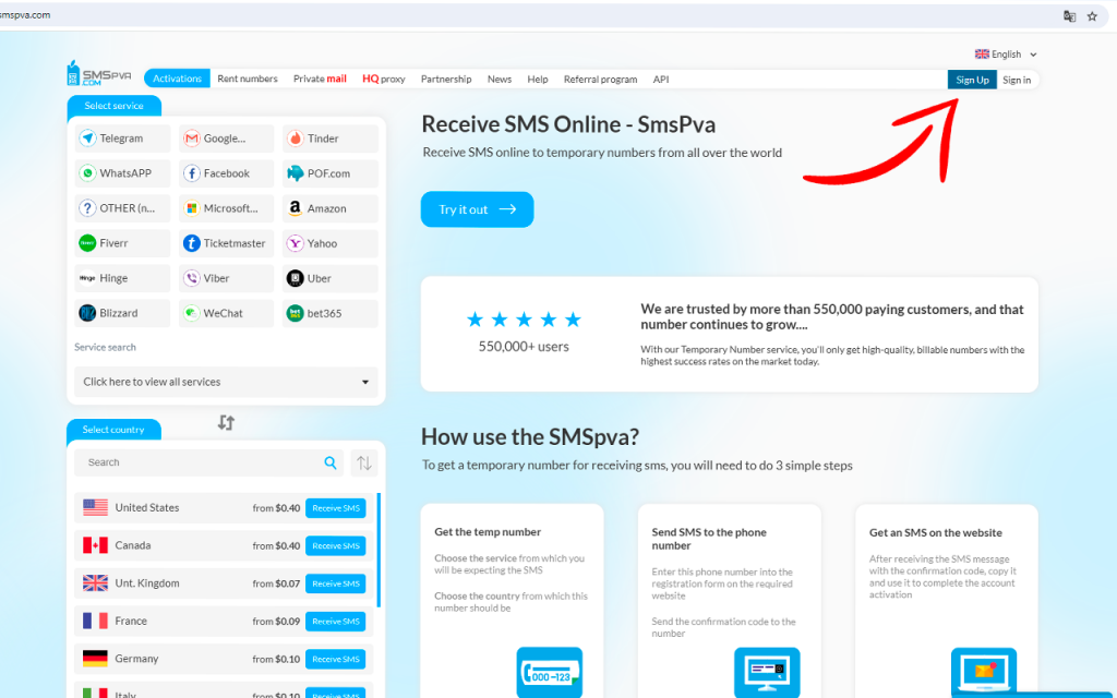 Passo 1: Registro no serviço de aluguel de números smspva.com