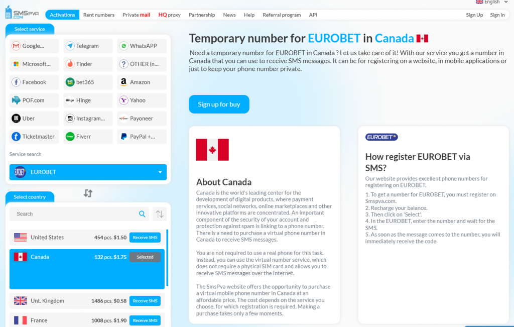 Trước khi bạn có thể đăng ký với Eurobet, bạn cần có một số điện thoại tạm thời thông qua SMSPVA. Làm theo các bước sau: